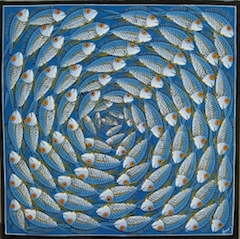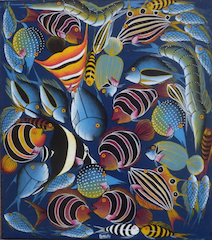 Il peint principalement des images avec beaucoup de poissons différents sur un fond très sombre.
