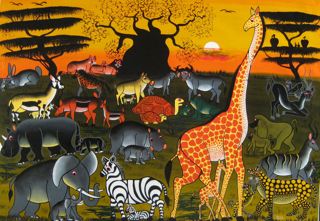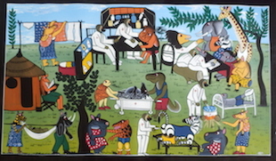 Issa adorait raconter des histoires avec ses peintures. Grâce à son imagination fertile, il inventait sans cesse des scènes élégantes avec des détails rigolos. Les animaux se comportent souvent comme des humains, comme sur les illustrations de son livre "Des artistes à quatre pattes", une histoire écrite par Agnes Mpata.